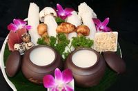 昆明官渡的地方特产,粑粑内含芝麻、花生、核桃等磨细果仁与白糖混合为馅,松软香甜,十分可口快意。刚出炉的粑粑非常烫手,顾客得用店家提供的"筲笈"来盛粑粑,等凉后再装袋拿走。